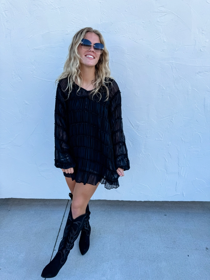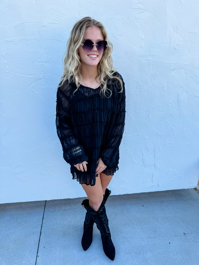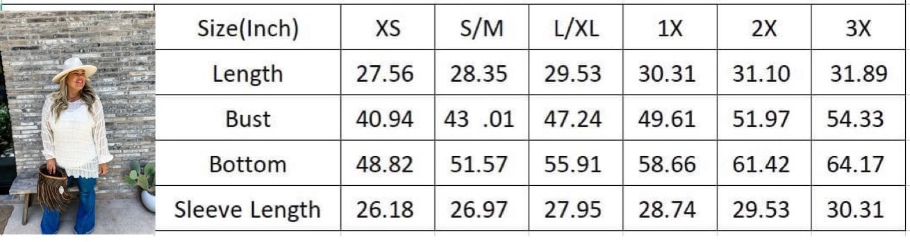 Features tiered ruched lace (that has slight stretch). Wrists have a stretchy elastic band and the neckline is a slight V-neck. Paired with a cami underneath (not sold with cami). This top perfectly mixes boho and elegance!